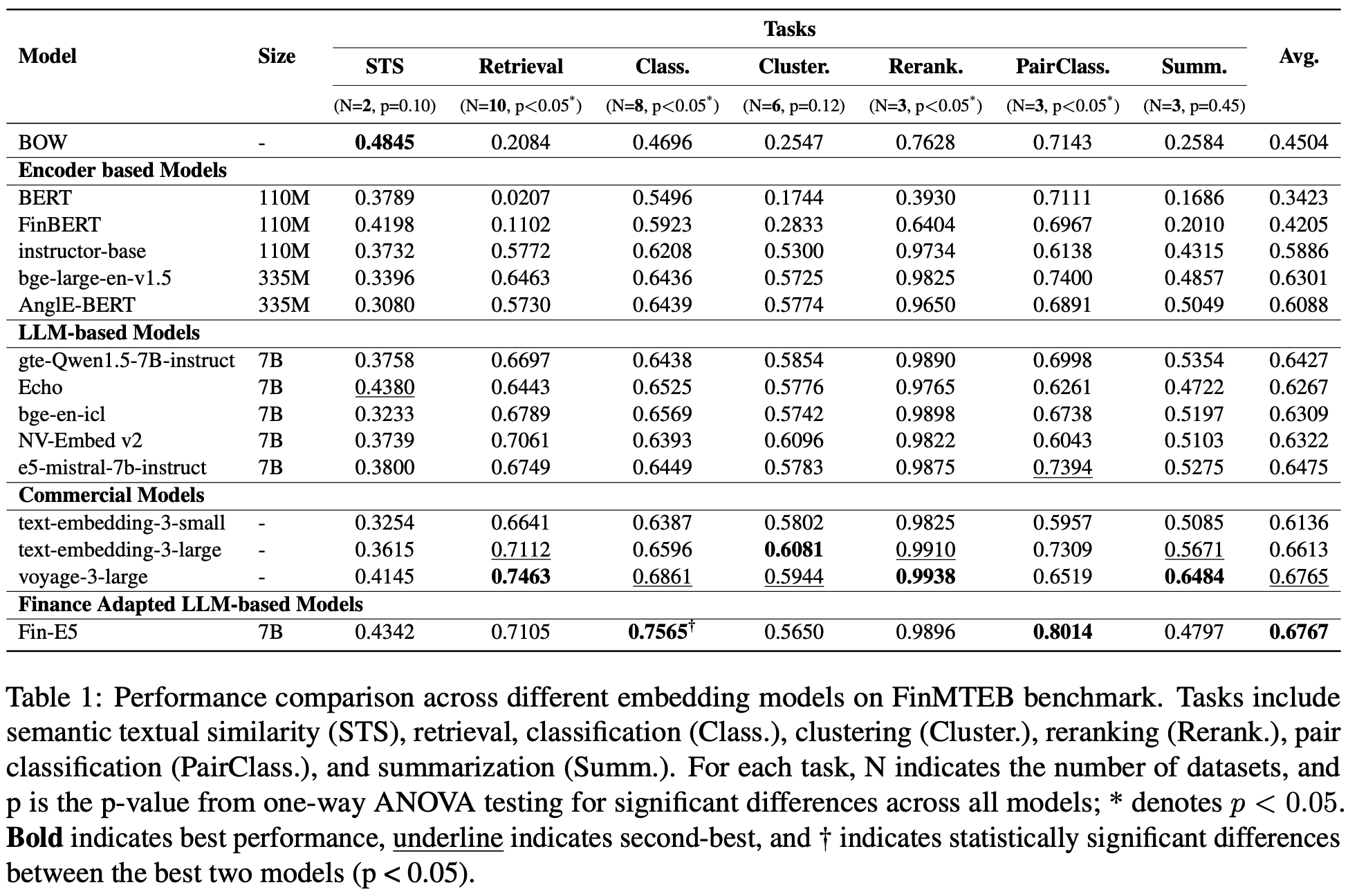 - domain-specific LLM (ex. Fin-E5)가 일반 LLM embedding보다 성능이 좋음