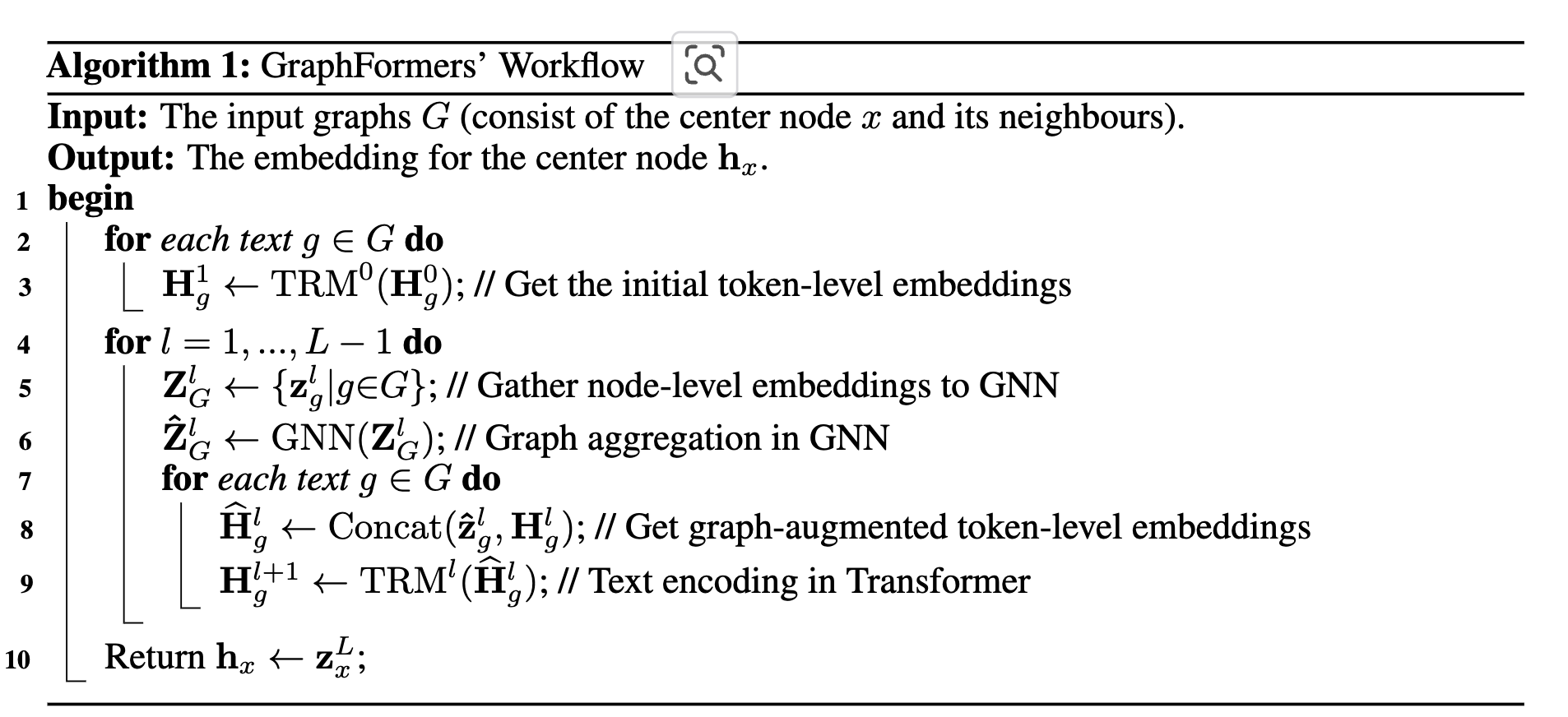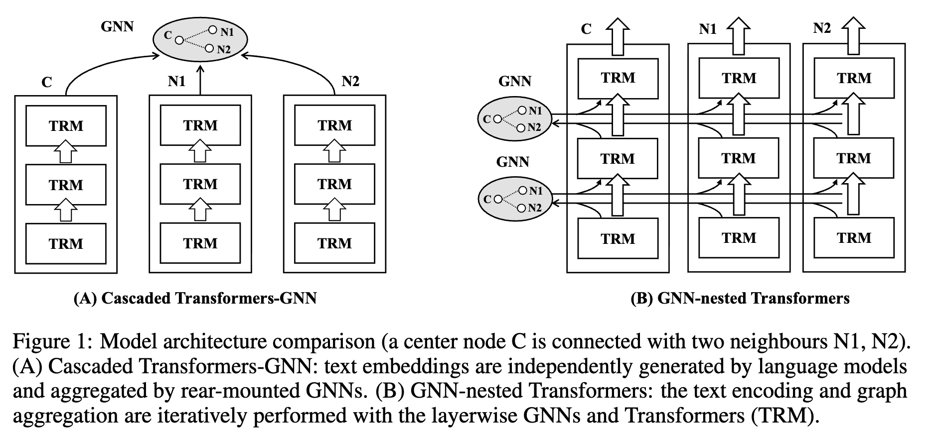 - GNN과 PLM을 fusion하기 위해 GNN component을 PLM의 중간 TRM (Transformers) alyer중간에 nested하게 넣는 GraphFormers를 제안함