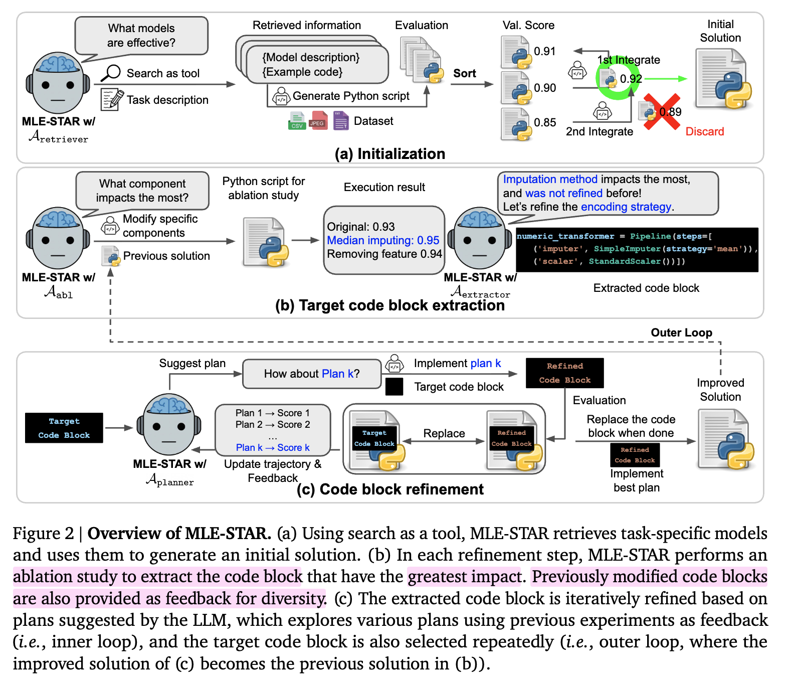 ML Engineering agent에 web Search와 TArgeted code block Refinement를 수행하는 MLE-STAR를 제안함
