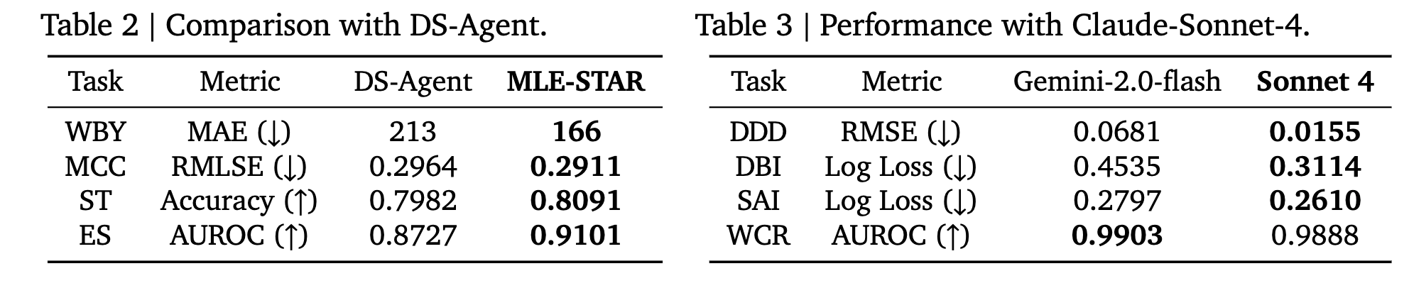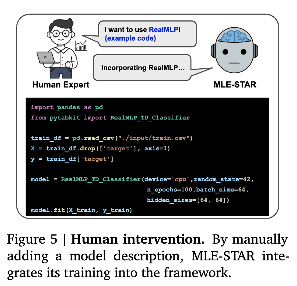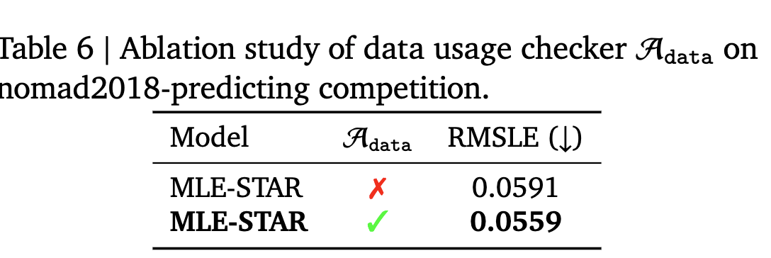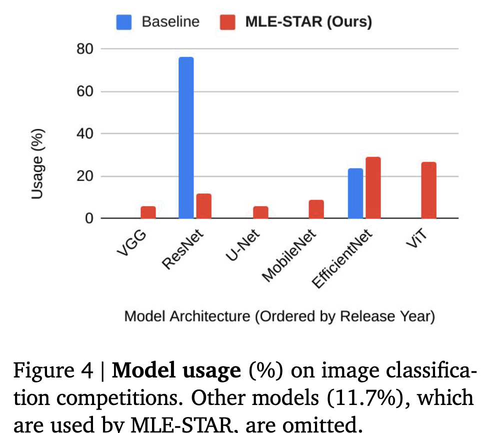- MLE-STAR가 최신 모델 (ViT, EfficientNet을 사용함. > ResNet)