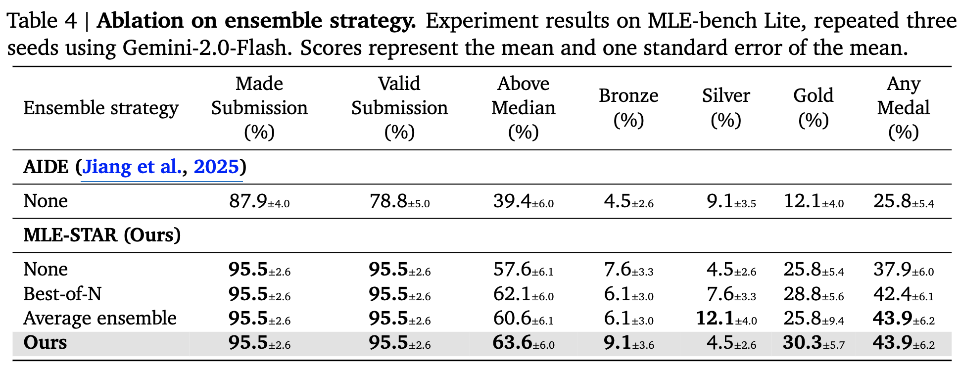 MLE-STAR의 계획하는 능력을 바탕으로 emsemble 전략도 탐험하도록 수행 (emsemble agent)