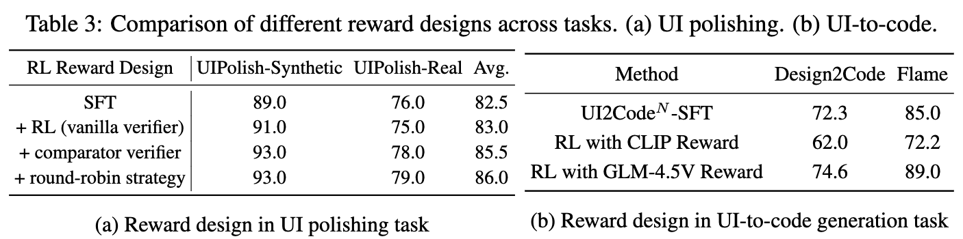 $\to$ 성능이 제일 좋은 propreitary model(GPT-5)도 UI-to-Code 76점이다.