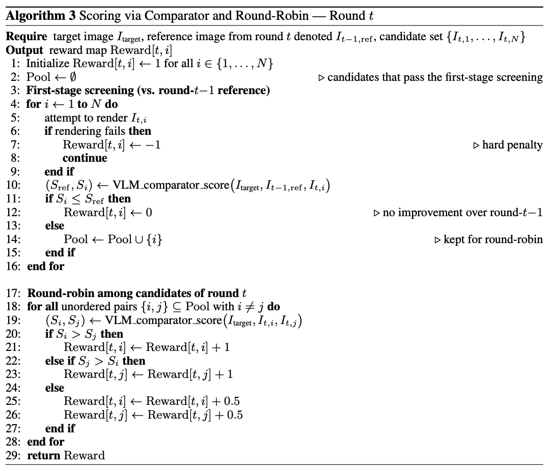 - VLM scoring: target screenshot A, 첫 생성된 (rendering된) B